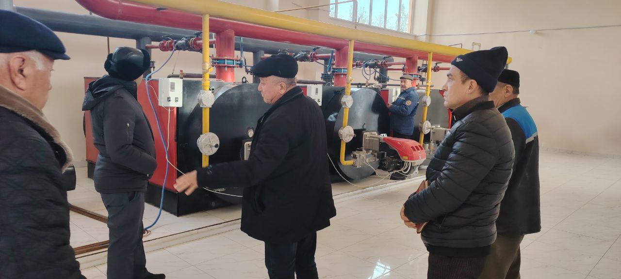 Jizzax viloyati Qurilish va uy-joy kommunal xo‘jaligi boshqarmasi mutasaddilari G‘allaorol tumani Marjonbuloq shaharcha qayta rekonstruksiya qilingan qozonxonani ko‘zdan kechirdilar